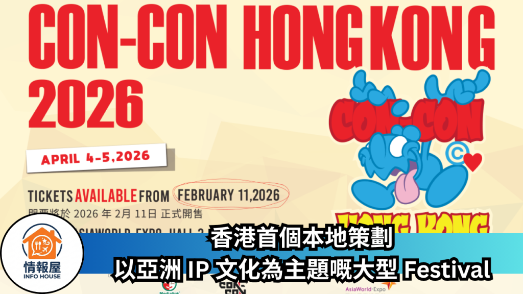 CON-CON HONG KONG 2026 係由香港本地公司 Medialink Entertainment 主辦,集合動漫、遊戲、音樂、潮流藝術等元素嘅大型跨界 IP 文化盛會,將於 2026 年 4 月 4 至 5 日喺亞洲國際博覽館 3、6、8、9 及 11 號館舉行。